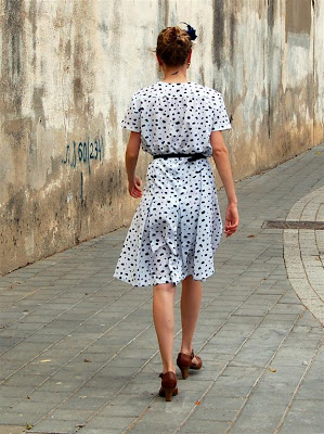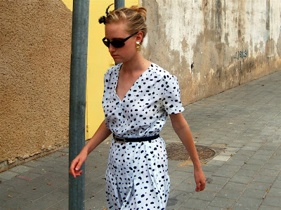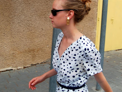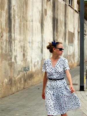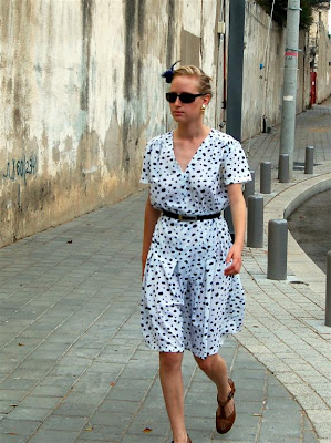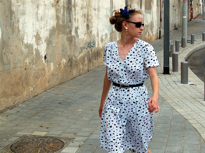 השמלה הזו היא אחת מהשמלות שקניתי בעשרה שקלים, יש לבה בד מאוד דק ומתנפנף (כבר עשתה לי קטע א-לה-מרלין מונרו) והגזרה שלה מאוד מיוחדת (יש לה כפלים בחלק התחתון שגורמים לקלוש). לגבי הדוגמה הדעות של חבריי חלוקות. כבר קיבלתי “מחמאות” קרואלה דה-ויל סטייל, אבל אני אוהבת אותה, ואולי דווקא בגלל שהיא לא הכתמים הדלמטים הקלאסיים, אלא כתמים כחולים.