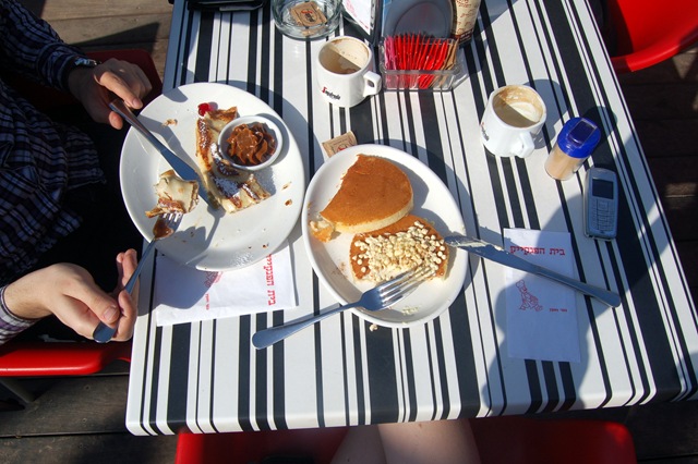ישבנו בשמש החורפית בחוץ ואכלתי פנקייק עם שוקולד לבן וקינמון- שילוב שאני וחברותיי מהקומונה רשמנו עליו פטנט. מי שלא ניסה לעולם לא יבין…